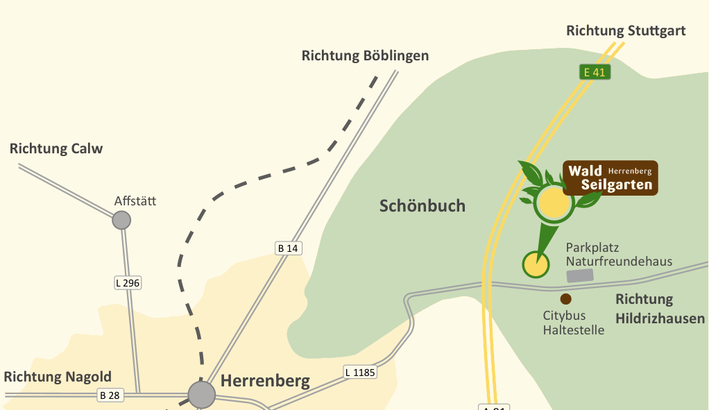 Nachhaltig in den Waldseilgarten mit Bus und Bahn! Nehmen Sie die S-Bahnlinie 1, die Regionalbahnlinie Horb-Stuttgart oder die Ammertalbahn und fahren Sie bis zur Haltestelle Herrenberg. Steigen Sie am ZOB Herrenberg auf die Buslinie 751 Richtung Holzgerlingen Friedhof bis Haltestelle um und fahren Sie bis zur Haltestelle Waldfriedhof. Von dort aus sind es ca. 15min Fußweg bis zum Waldseilgarten. Bitte beachten Sie den aktuellen Fahrplan.